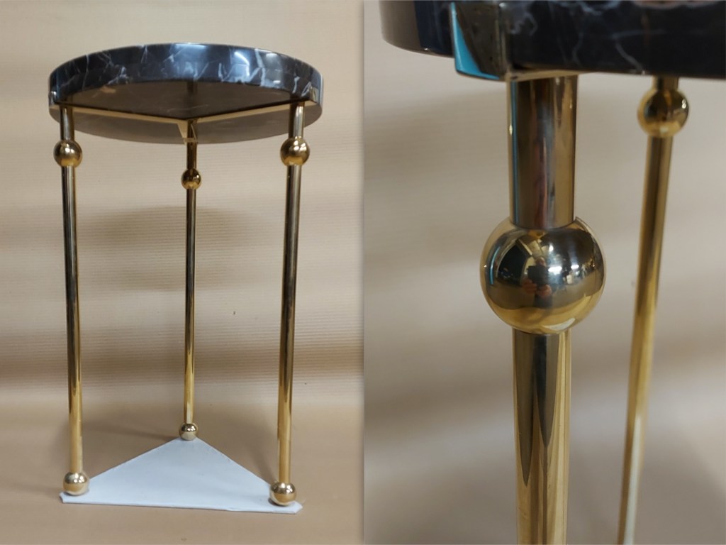 Polished brass side table with a solid marble top.