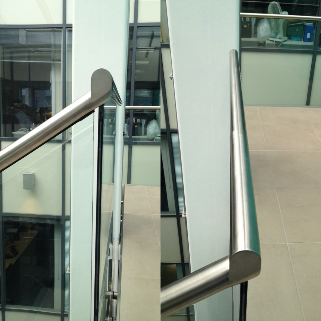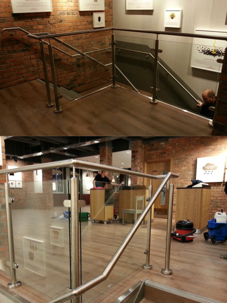 Glass and stainless steel balustrade in Pret A Manger.
