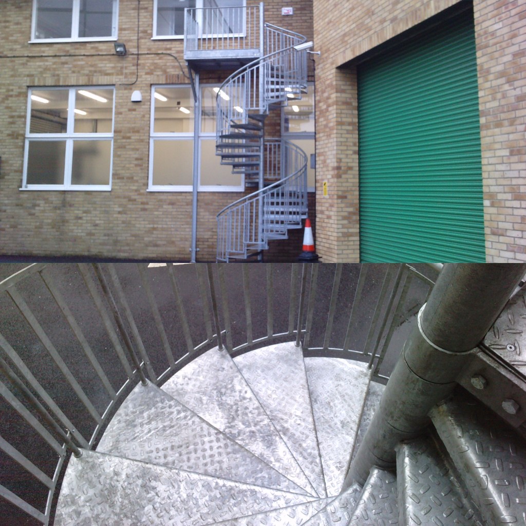 Outdoor spiral staircase made from mild steel and then hot dipped galvanised.