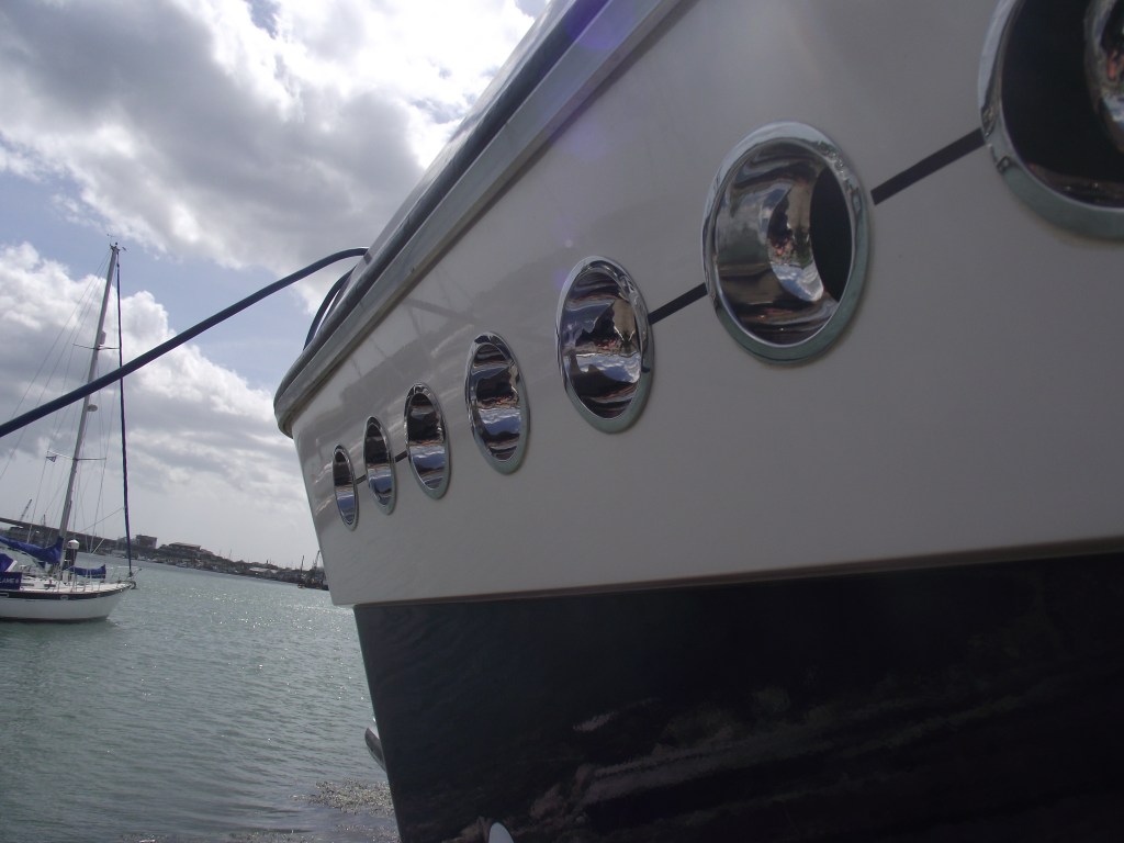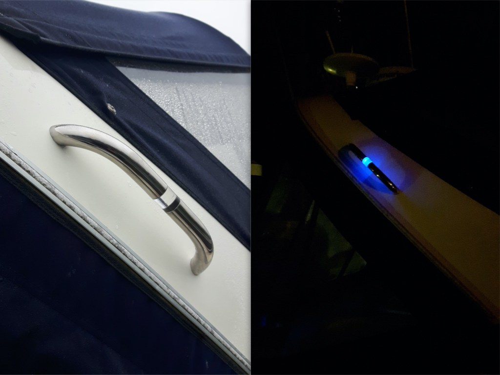 Stainless steel grab rail with light designed by us and installed for a boat on the South Coast.