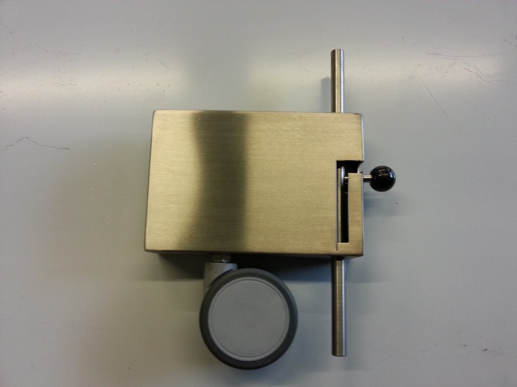 Jockey wheel and lock for a glass door.